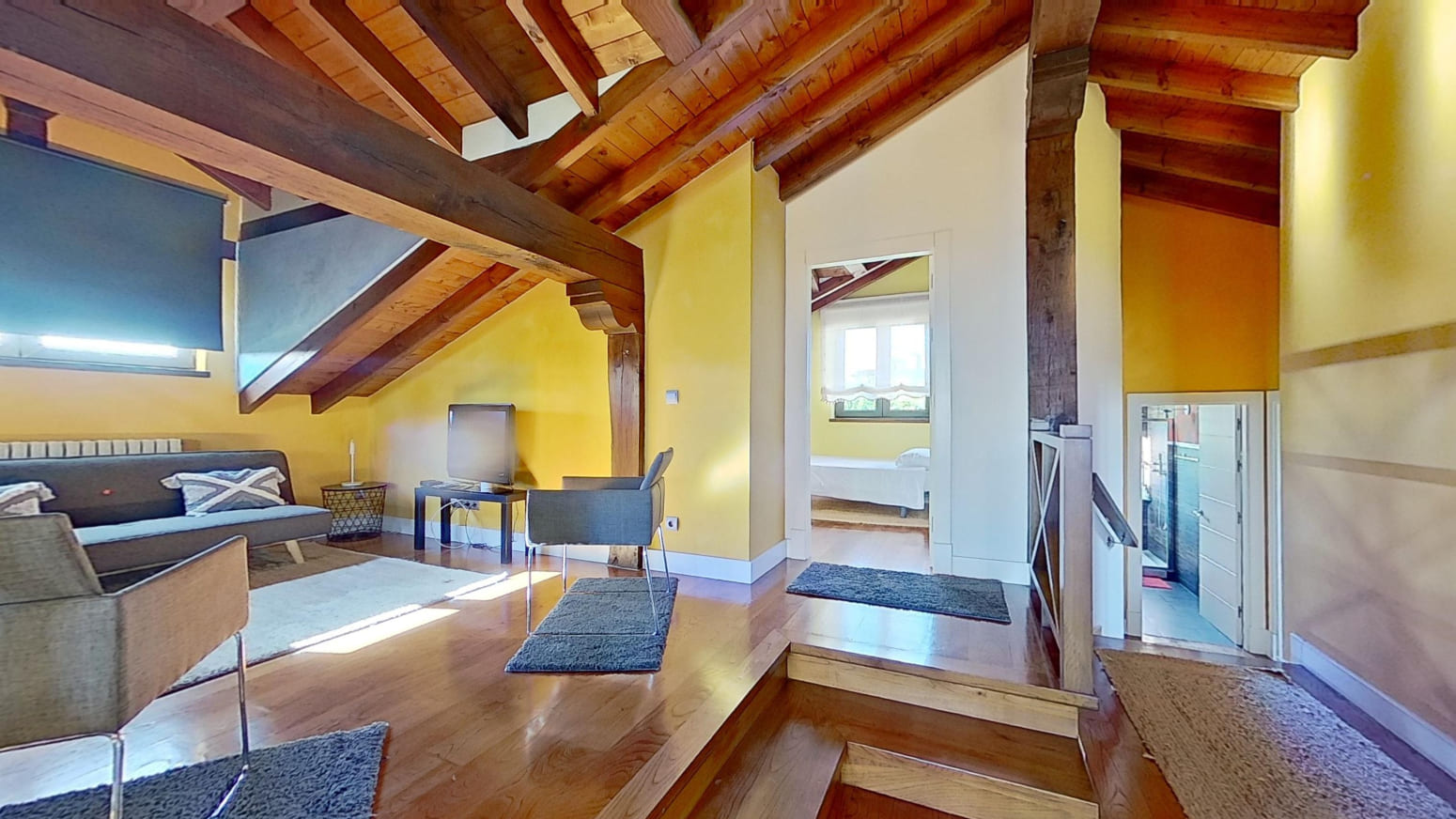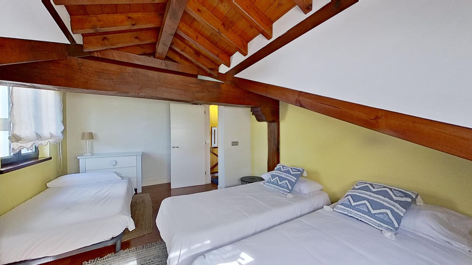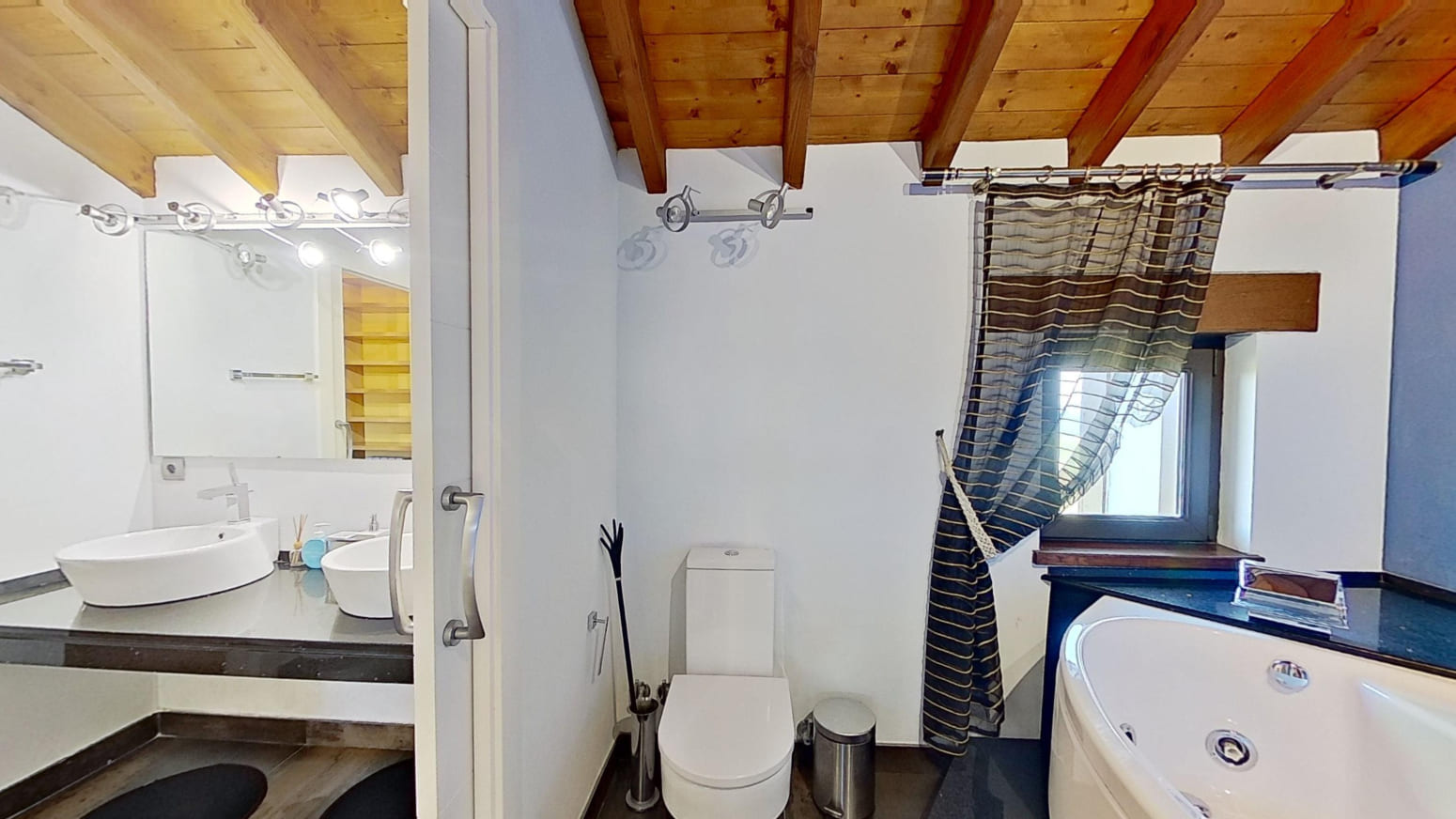 La propiedad está repartida en dos alturas, planta primera y bajo cubierta con techos de madera, en la primera planta se encuentra una amplia y espaciosa cocina modelo Valcucine, el salón comedor con chimenea Stuv de Bélgica lo que le hace una estancia muy acogedor y desde sus grandes ventanales se pueden apreciar las maravillosas vistas al mar, un baño completo y un dormitorio. En la planta bajo cubierta está el distribuidor que da paso a los tres dormitorios, con dos baños completos. Los tres baños de elegantes acabados Porcelanosa, cada uno está equipado con elementos de calidad que aportan un toque de lujo.